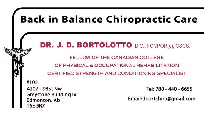 My clinic is a long established chiropractic office servicing Edmonton since 1980. My clinic accepts third party insurance and/ or WCB. Dr Bortolotto is one of two Rehabilitation Specialists in Edmonton which is a wonderful adjunct to regular Chiropractic care. Dr. Bortolotto is also a Certified Strength & Conditioning Specialist and is concluding his Diplomate Program in Neurology. Dr Bortolotto has 14 years experience working at the WCB Rehabilitation Center ( Millard ) & 4 years at the Gross Chronic Pain Clinic in a large multidisciplinary setting.
