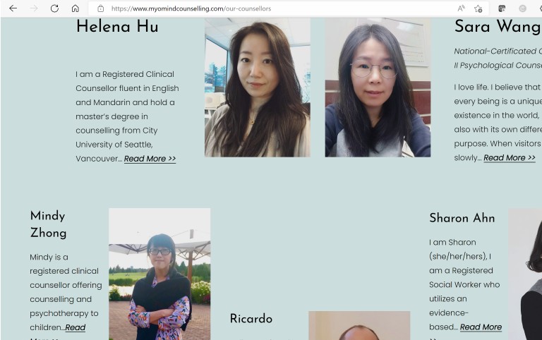 We are all at one point looking for the key to a path/door/solution or someone in our lives. We know it could feel lonely to walk the journey alone. You don’t have to. We would like to be your company to find the key or just be there for you. Maybe the key is within you. MyOMind counselling is based in the beautiful British Columbia in Canada. With years of experience and a heart for care, our counselling team will provide you with a safe place to share, discover yourself and grow. 我们的服务理念是:尊重关注每一位来访者,提供专业的咨询体验。 我们的服务领域是:婚姻情感,个人成长,一般心理问题咨询、青少年心理、亲子咨询、职业心理辅导、团体心理辅导、育儿课程、婚前指导课程等