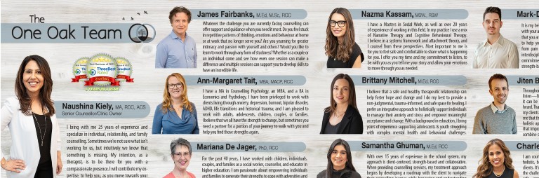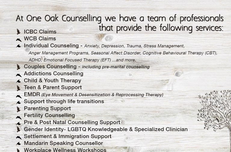 At One Oak Counselling we have a team of professionals that provide the following services: - ICBC claims - WCB claims - Individual counseling - anxiety, depression, trauma, stress management, anger management programs, Seasonal Affect Disorder, ADHD, Cognitive Behavioural Therapy (CBT), Emotional Focused Therapy (EFT), and more - Couples counselling - including pre-marital counselling - Addictions counselling - Child and Youth Therapy - Teen and parent support - EMDR (Eye Movement and Desensitization and Reprocessing Therapy) - Support through life transitions - Parenting support